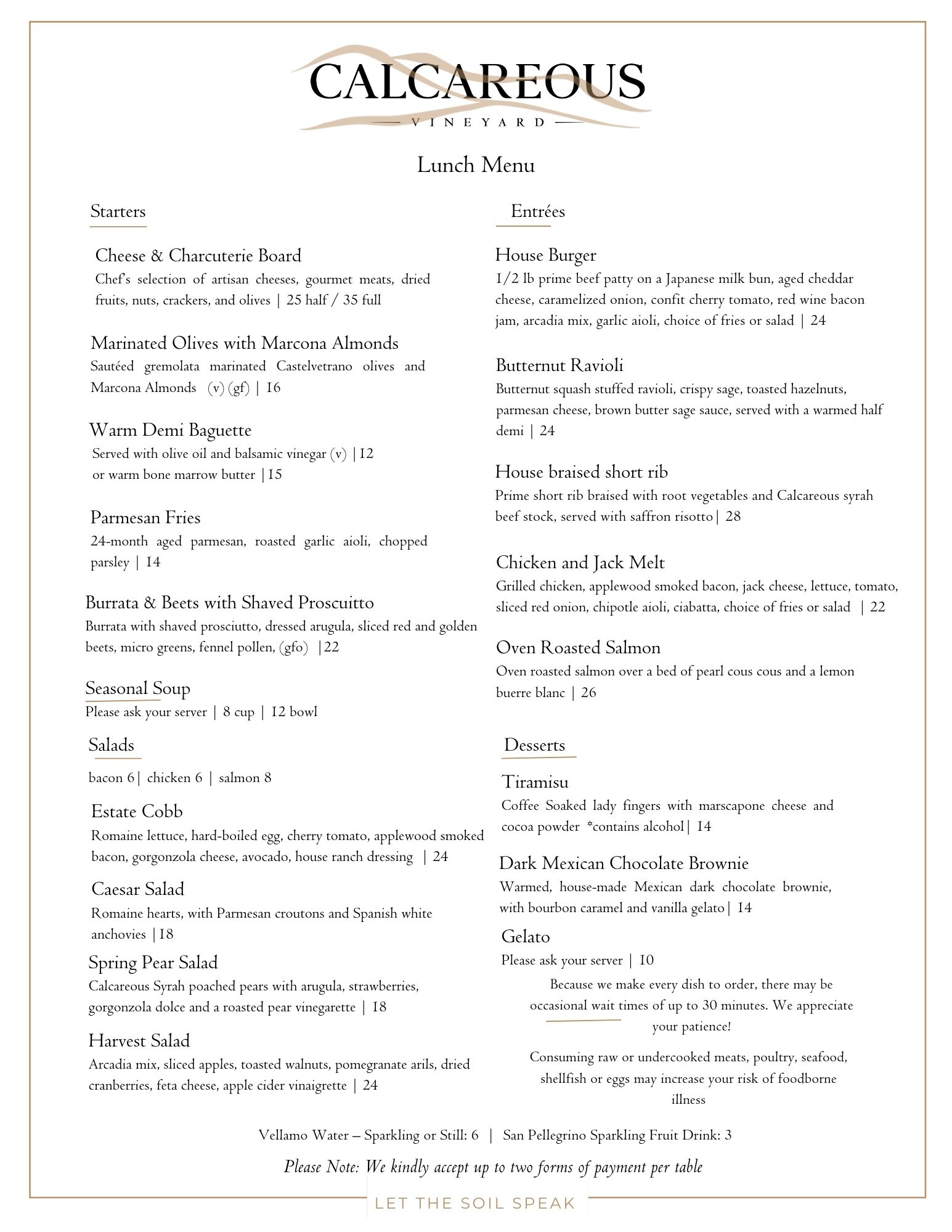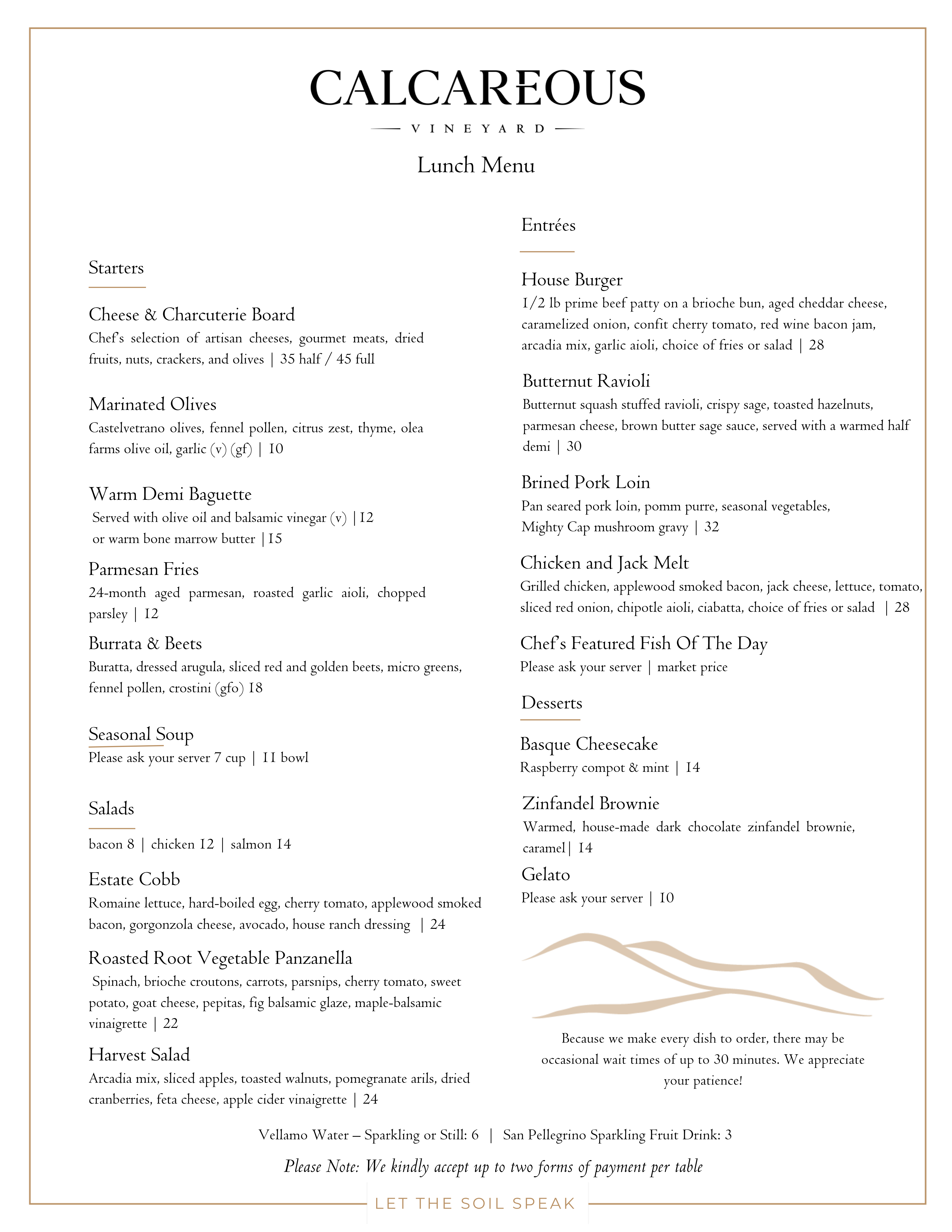 The seasonal menu is offered daily from 10:30am to 4:30pm for pairing with your favorite Calcareous wines. Based on the availability of local ingredients, selections may vary on the day of your visit. Book your experience today!